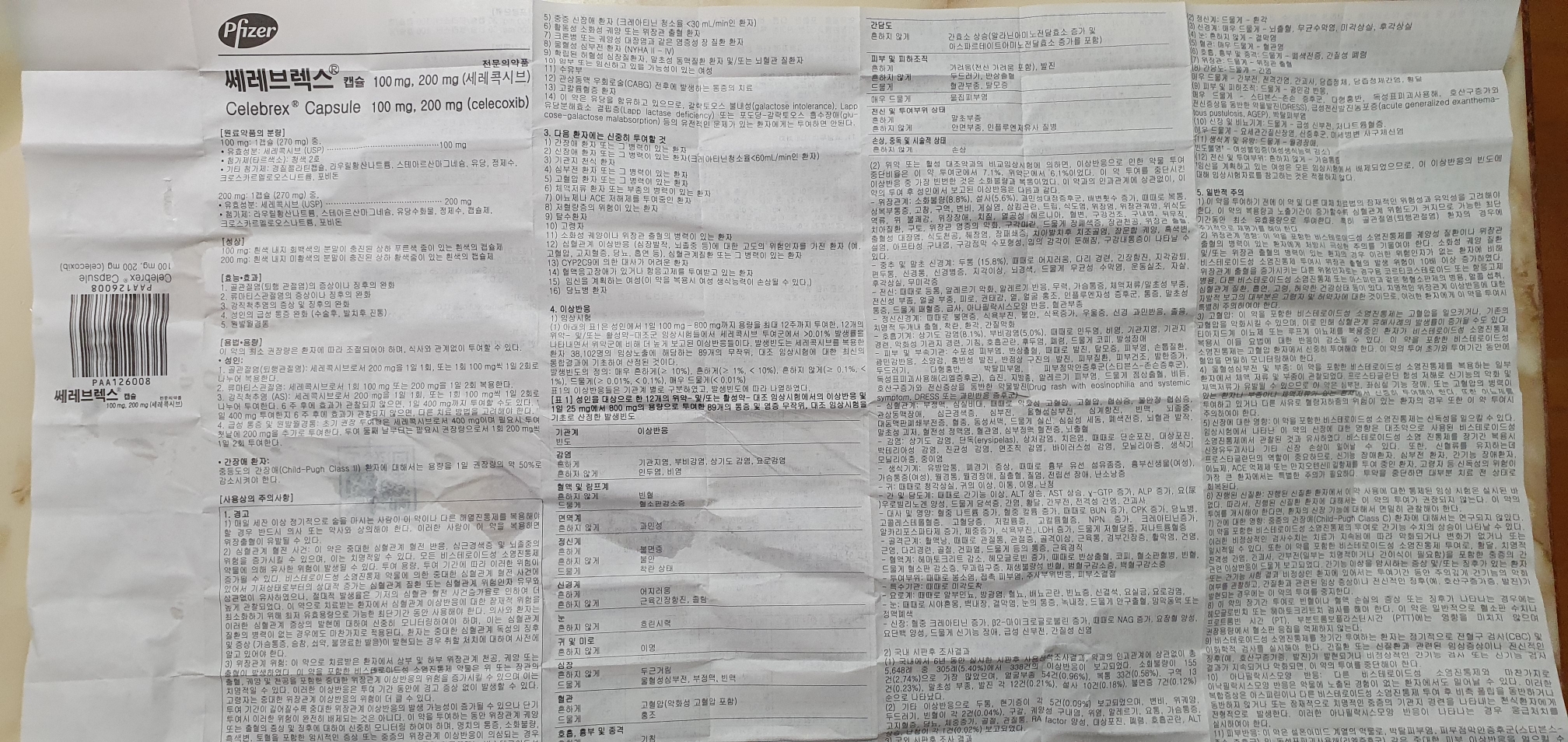 (1) 아래의 표1은 성인에서 1일 100 mg - 800 mg까지 용량을 최대 12주까지 투여한, 12개의 위약- 및/또는 활성약-대조군 임상시험들에서 세레콕시브 투여군에서 >0.01% 발생률을 나타내면서 위약군에 비해 더 높게 보고된 이상반응들이다. 발생빈도는 세레콕시브를 복용한 환자 38,102명의 임상 노출에 해당하는 89개의 무작위, 대조 임상시험에 대한 최신의 통합결과에 기초하여 산정된 것이다.