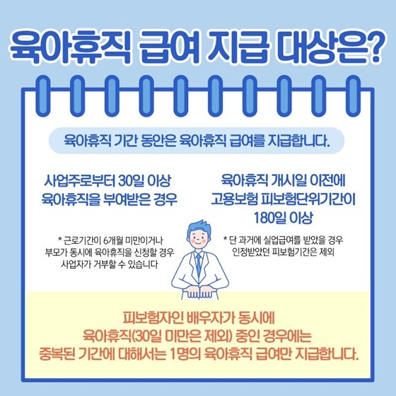 육아휴직 기간 동안은 육아휴직 급여를 지급합니다. 사업주로부터 30일 이상 육아휴직을 부여받은 경우, 육아휴직 개시일 이전에 고용보험 피보험단위기간이 180일 이상인 경우 대상입니다. 피보험자인 배우자가 동시에 육아휴직(30일 미만은 제외) 중인 경우에는 중복된 기간에 대해서는 1명의 육아휴직 급여만 지급합니다.