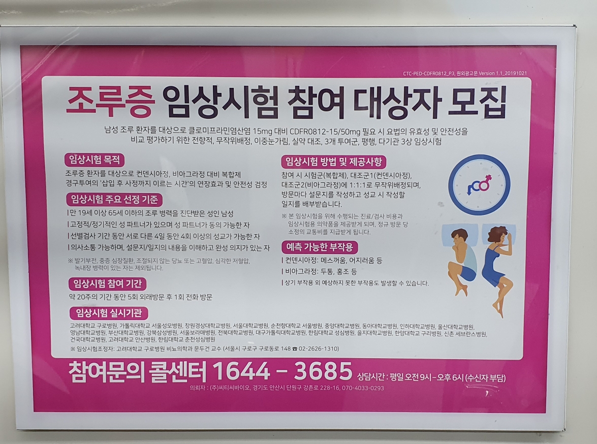 임상실험 실시기관 : 고려대학교 구로병원, 카톨릭대학교, 서울성모병원, 창원경상대학병원, 서율대학병원, 순천항대학교 서울병원, 중앙대학교병원, 산촌세브란스 등등