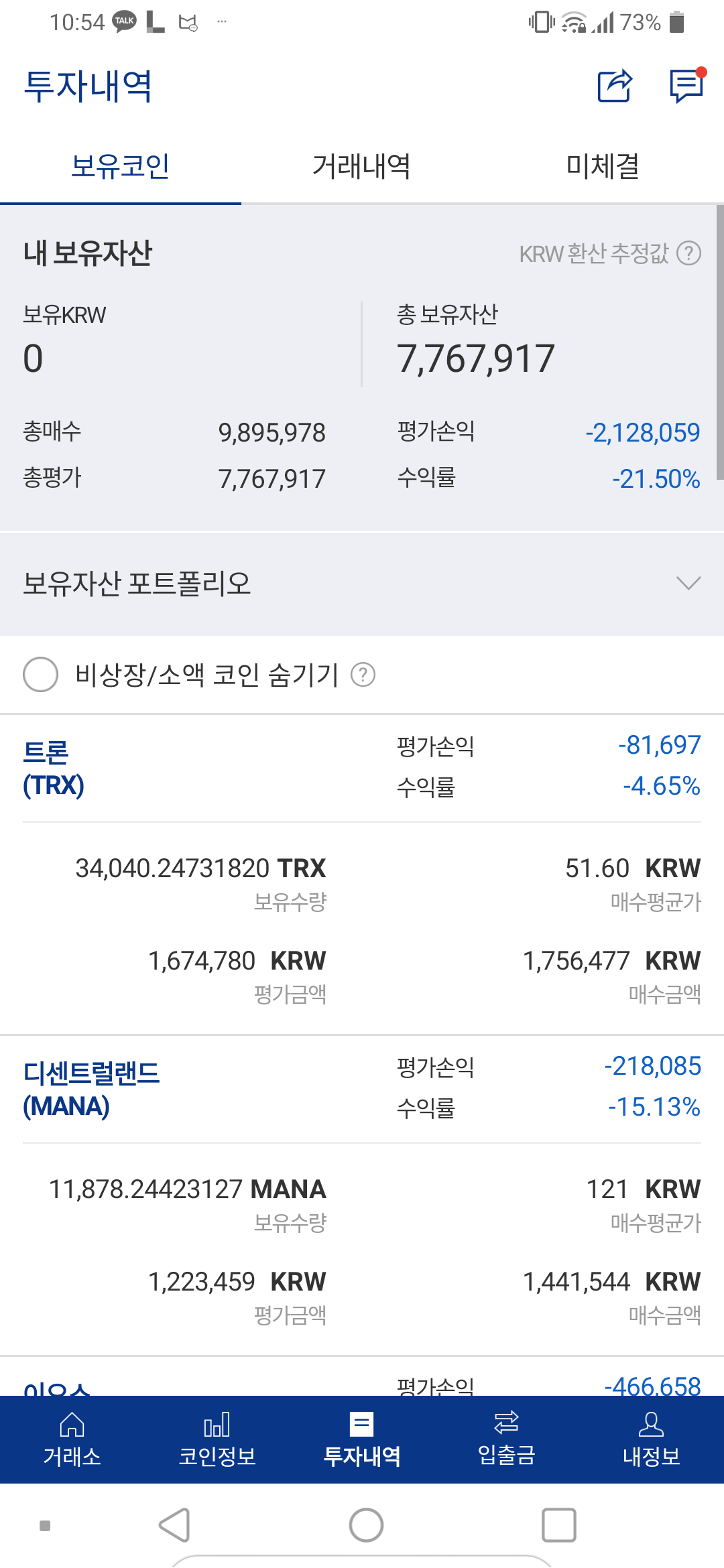 자고 일어나 업비트만 계좌를 보니 꽤 많이 하락했네요.