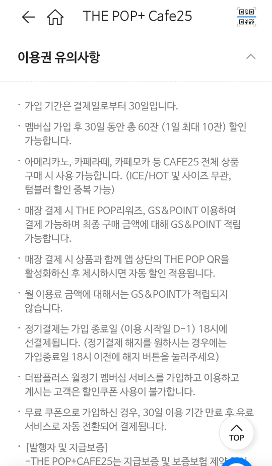 | 총 결제 금액 : 10,000 - 2,500 (더팝플러스 카페 25 정기권 25% 할인) - 500 (통신사 5% 할인) = 결제금 : 7,000원 |
