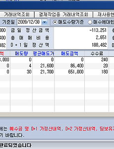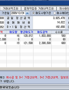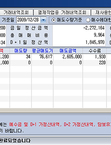 한전KPS 장 시작 후 적절한 가격에 잡고 +5% 일때 던질 수 있는 기회가 있었습니다만... 제대로 처리하지 못하는 실수를 이틀째 하고있네요;; 어제 매수한 현대건설 포함해서 내년중 꼭 손실없이 처리해야 하는 부담되는 두 종목 해결이 2010년 처음 과제가 될거 같습니다. [현대차] 매수가 : 100,400 매도가 : 119,000 매도량 : 3 총수익 : 54,630원 [한전KPS] 매수가 : 42,416 매도가 : 45,000 매도량 : 10 총수익 : 23,624원 [LG전자] 매수가 : 107,714 매도가 : 120,000 매도량 : 1 총수익 : 11,896원